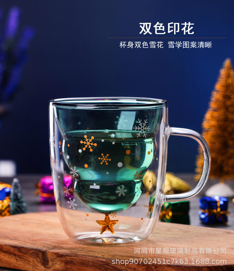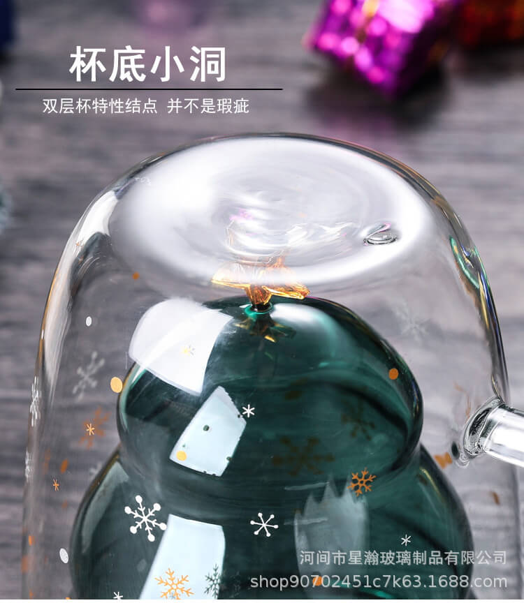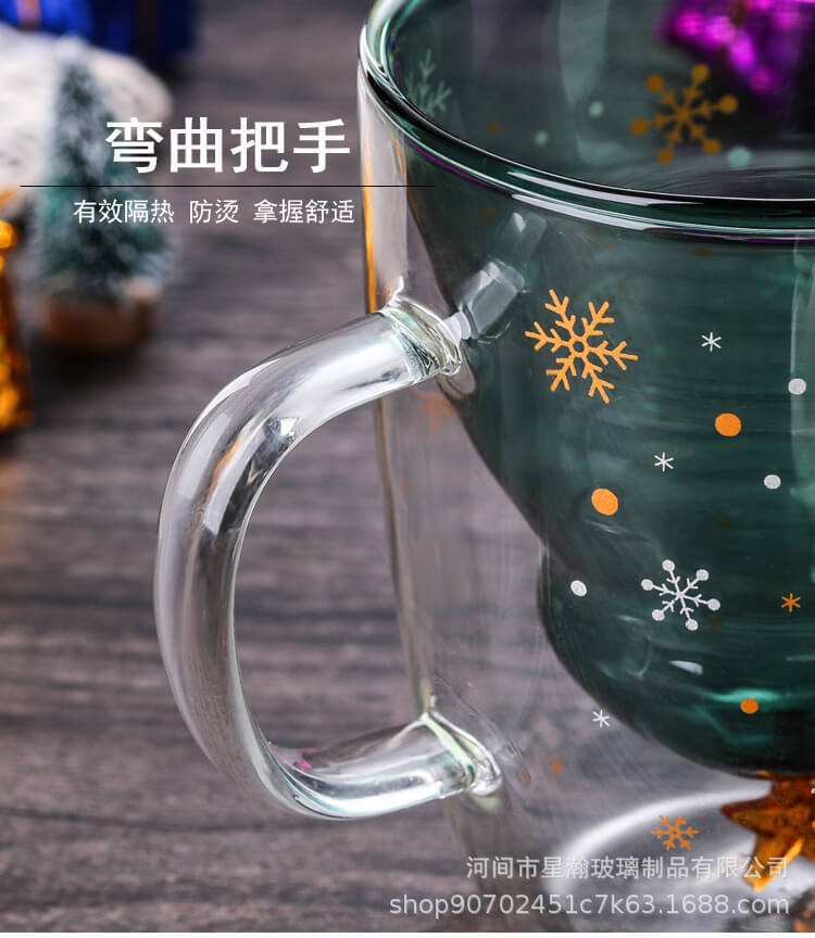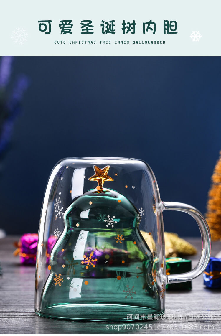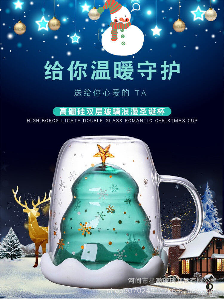 创意可爱隔热圣诞杯家用耐高温咖啡牛奶杯立体圣诞树双层玻璃杯
