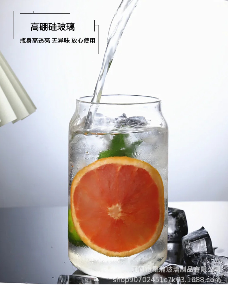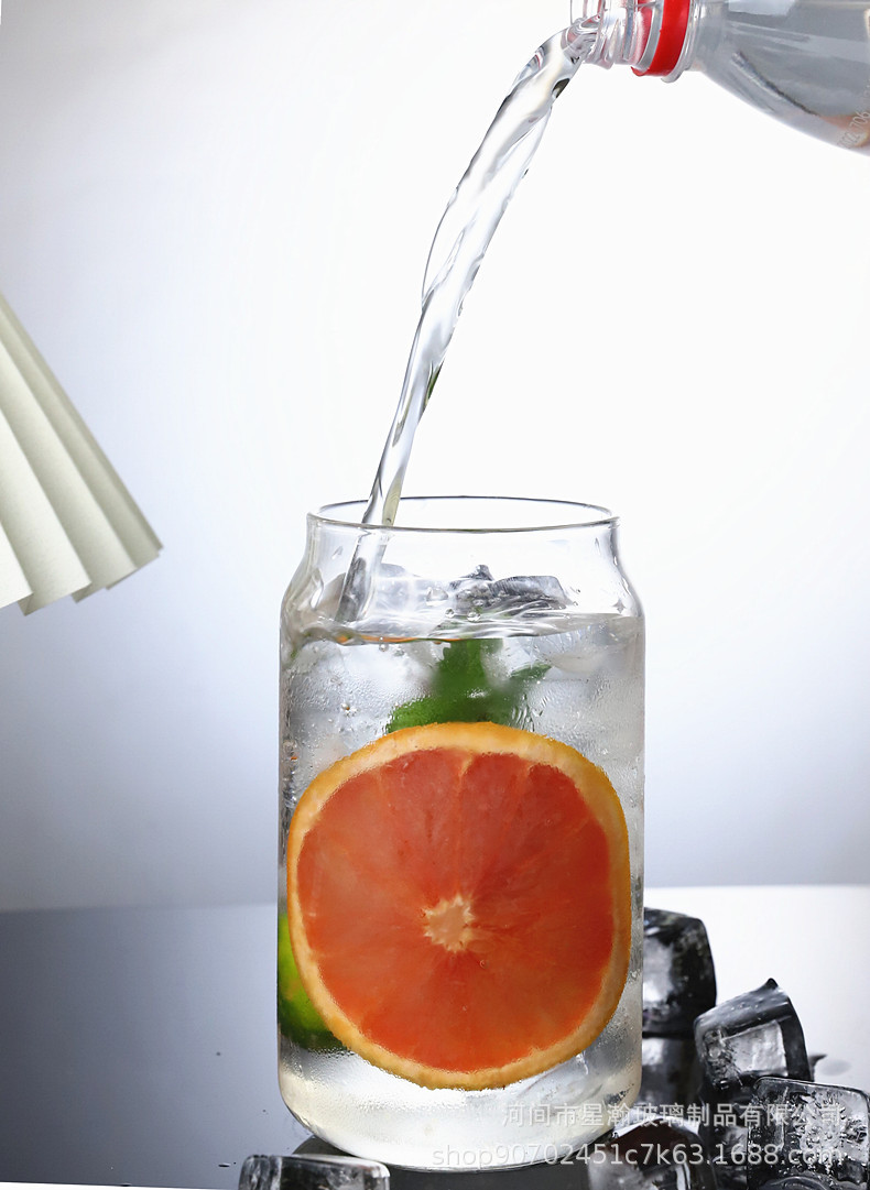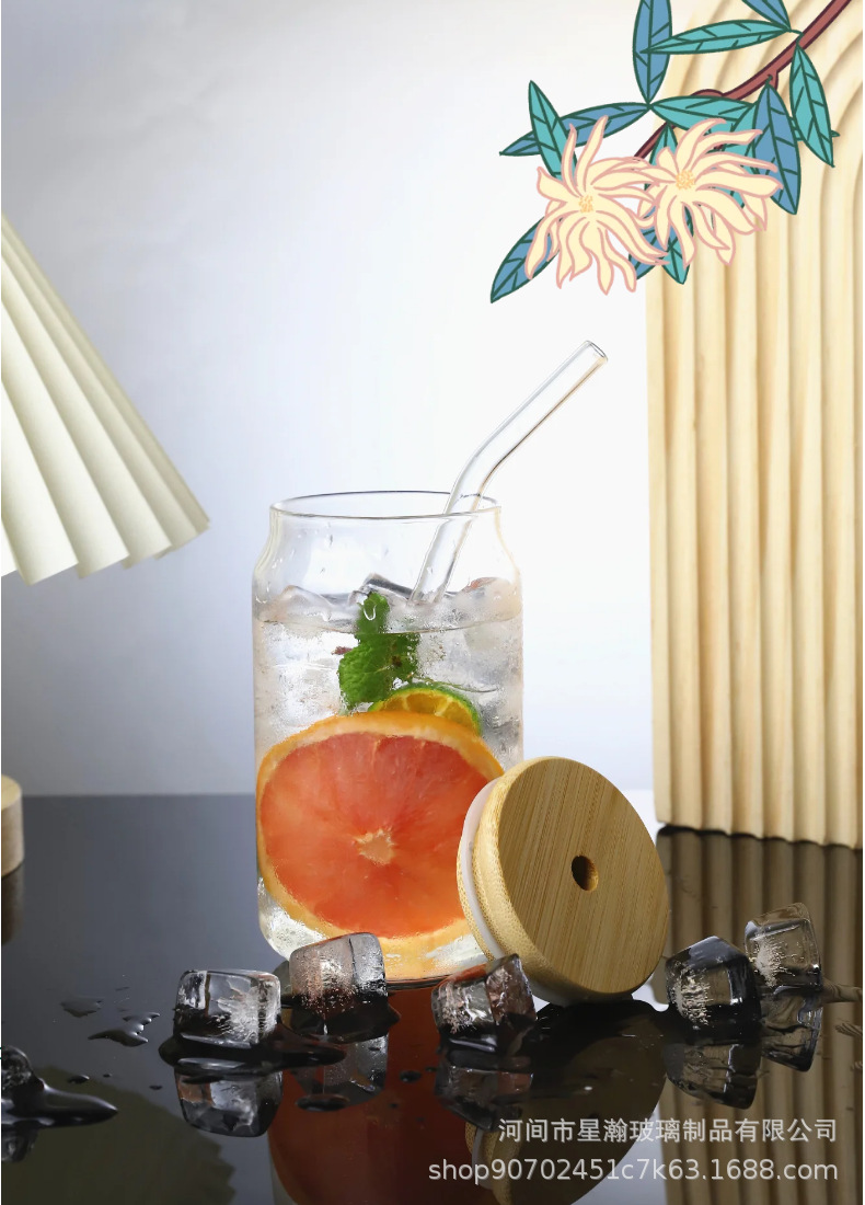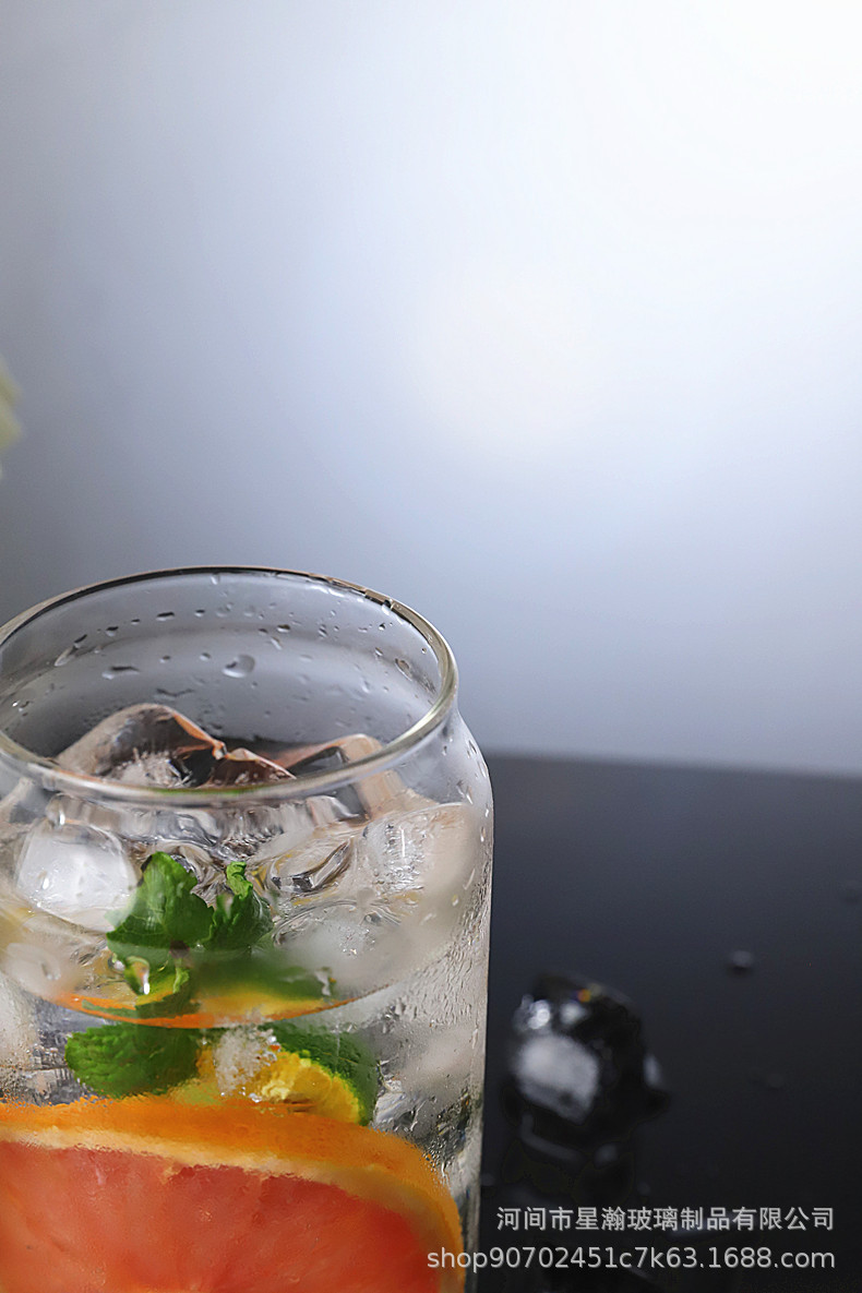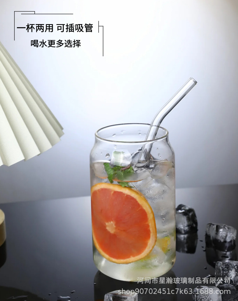 家用带吸管玻璃咖啡饮料喝水单层杯透明玻璃带盖易拉罐造型可乐杯