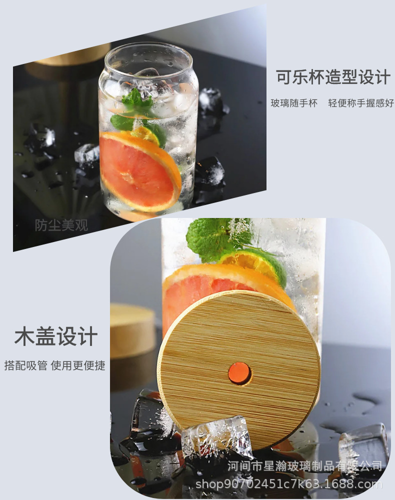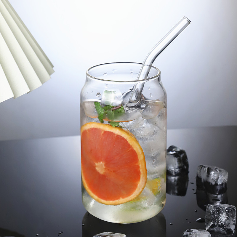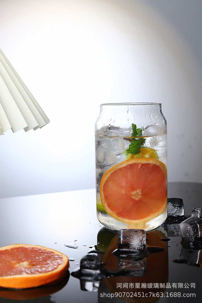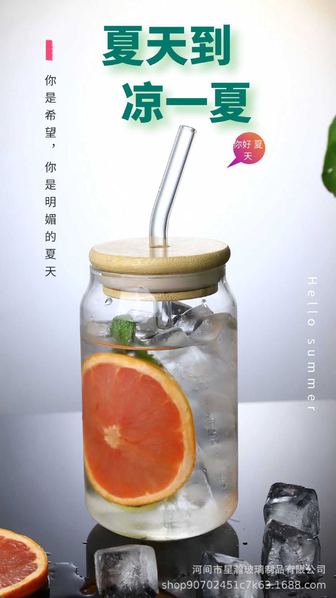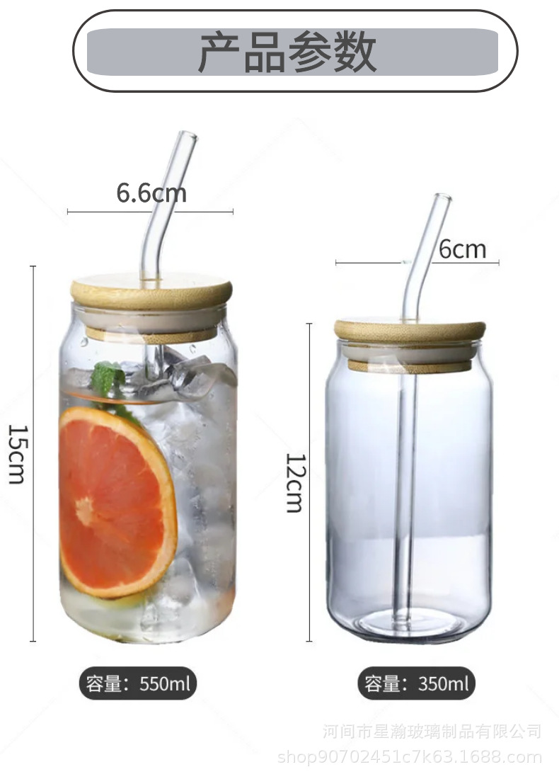 家用带吸管玻璃咖啡饮料喝水单层杯透明玻璃带盖易拉罐造型可乐杯