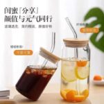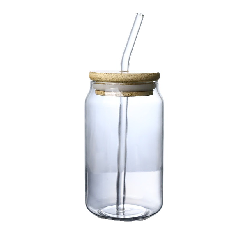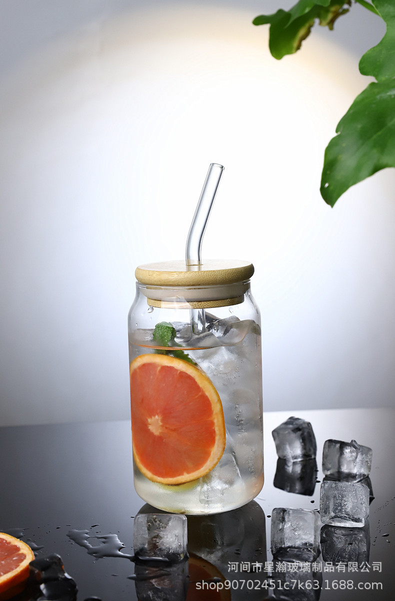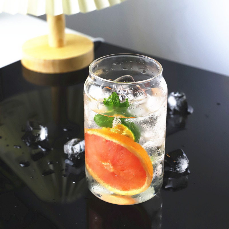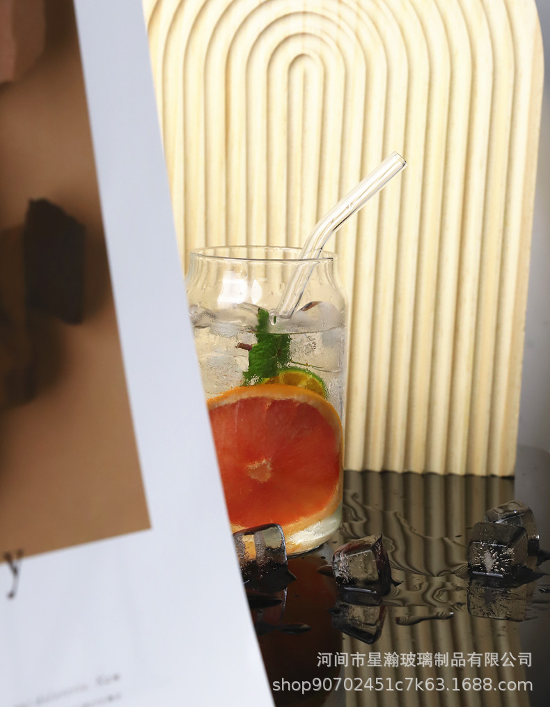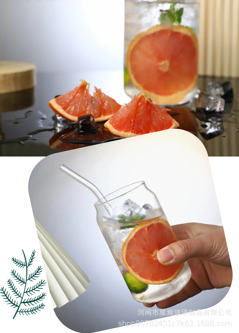 家用带吸管玻璃咖啡饮料喝水单层杯透明玻璃带盖易拉罐造型可乐杯