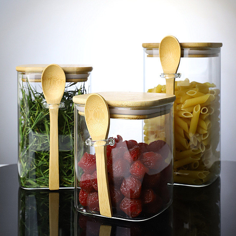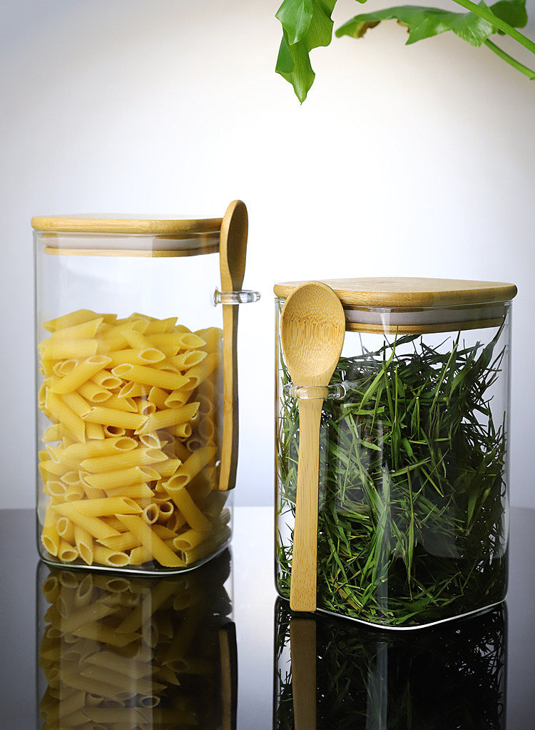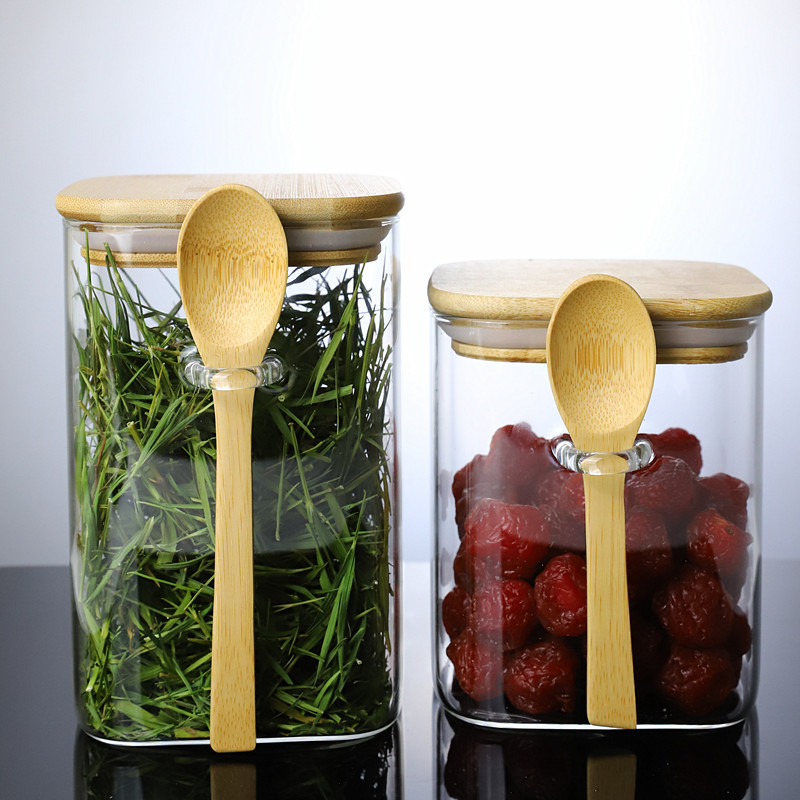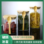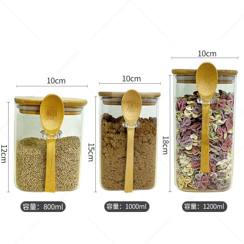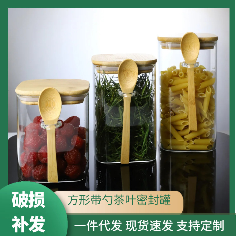 厂家可定制玻璃方形玻璃茶叶密封罐厨房杂粮储物罐带勺零食密封罐